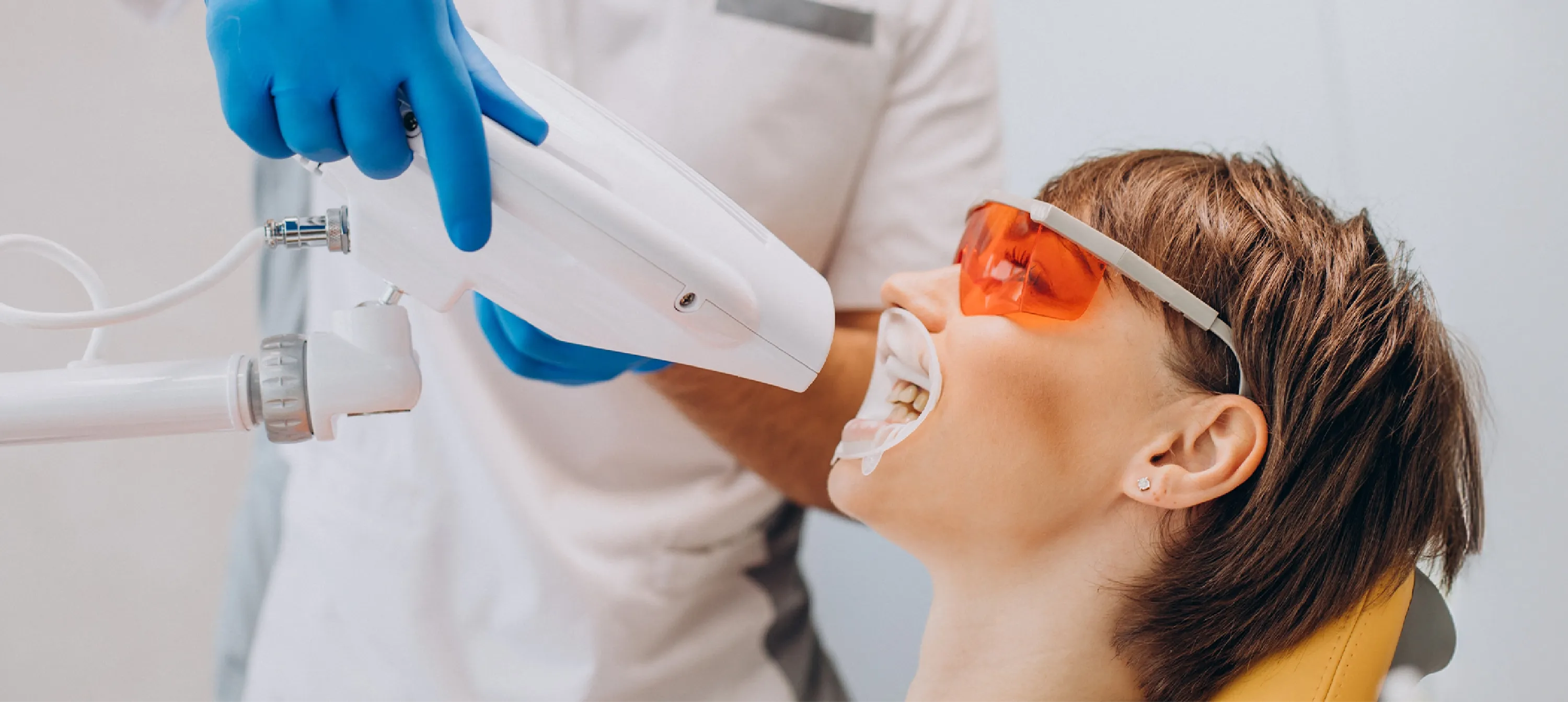 لذلك، يقوم طبيب الأسنان بوضع جل مخصص يحتوي عادةً على بيروكسيد الهيدروجين. ولتمكينه من اختراق المينا، يتم تنشيط الجل باستخدام أشعة UV آمنة، ما يسرّع تفاعله ويجعله أكثر فاعلية في تفتيت البقع والتخلص منها.